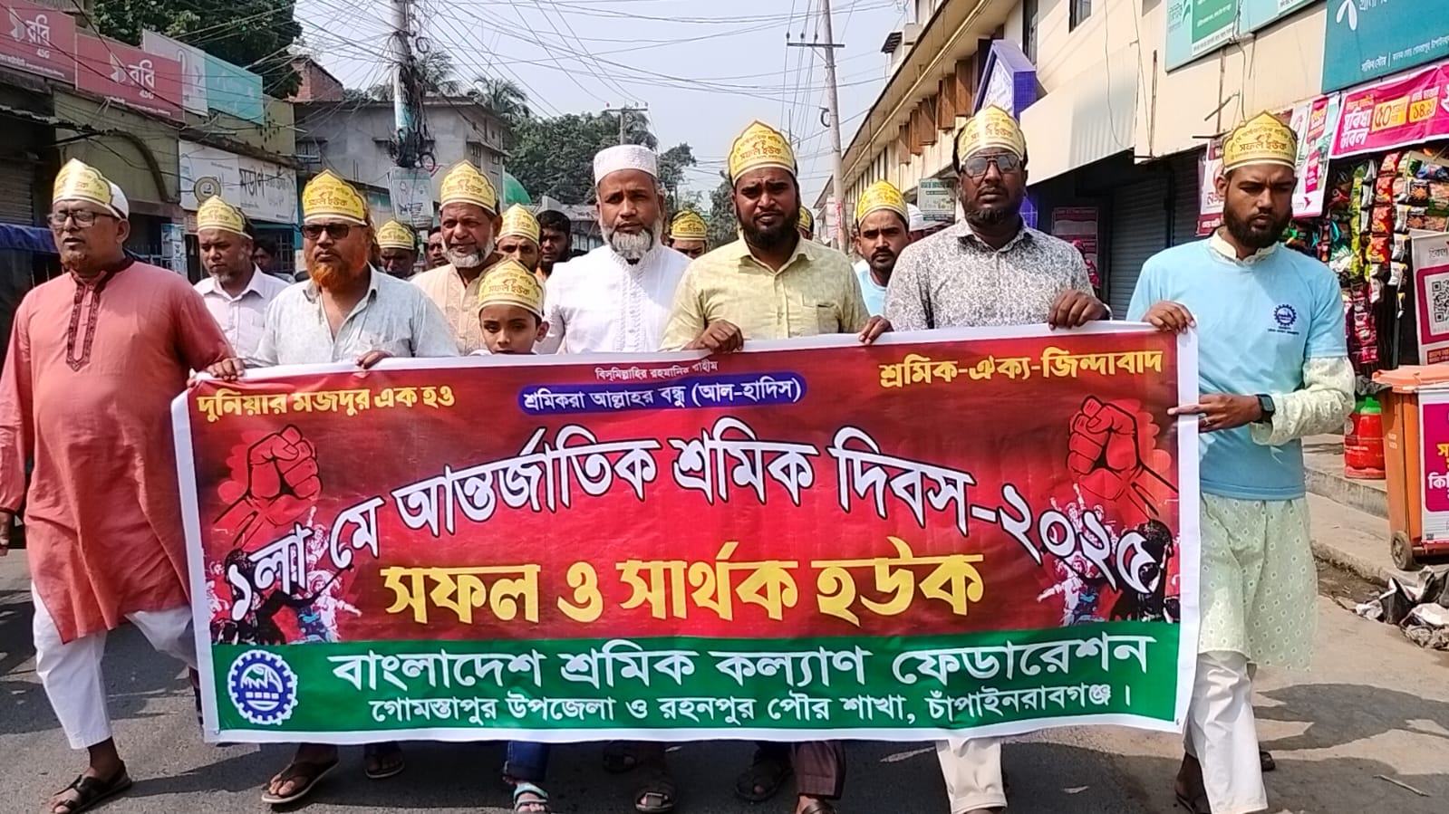 বৃহস্পতিবার(১লা মে) সকালে রহনপুর পৌর ও গোমস্তাপুর উপজেলা শ্রমিক কল্যাণ ফেডারেশনের উদ্যোগে রহনপুর ইউসুফ আলী সরকারী কলেজ থেকে র্যালীটি বের হয়ে শহরের প্রধান প্রধান সড়ক প্রদক্ষিণ শেষে রহনপুর নুনগোলা বাস স্ট্যান্ডে গিয়ে শেষ হয়। সেখানে বক্তব্য রাখেন বাংলাদেশ জামায়েত ইসলামী চাঁপাইনবাবগঞ্জ জেলা শাখার সহকারি সেক্রেটারি ও ৪৪চাপাইনবাবগঞ্জ -২ আসনের জামাত মনোনীত প্রার্থী ডঃ মিজানুর রহমান,গোমস্তাপুর উপজেলা শ্রমিক কল্যাণ ফেডারেশন এর সভাপতি আনসারুল হক মাস্টার, রহনপুর পৌর জামাত মনোনীত মেয়র প্রার্থী তরিকুল ইসলাম বকুল, রহনপুর পৌর শ্রমিক কল্যাণ ফেডারেশন সভাপতি শহিদুল ইসলাম, রহনপুর পৌর আমীর মনিরুজ্জামান ডাব্লু,রহনপুর পৌর সাবেক শ্রমিক কল্যাণ ফেডারেশনের সভাপতি বাদল আলী সহ আরো অন্যরা।