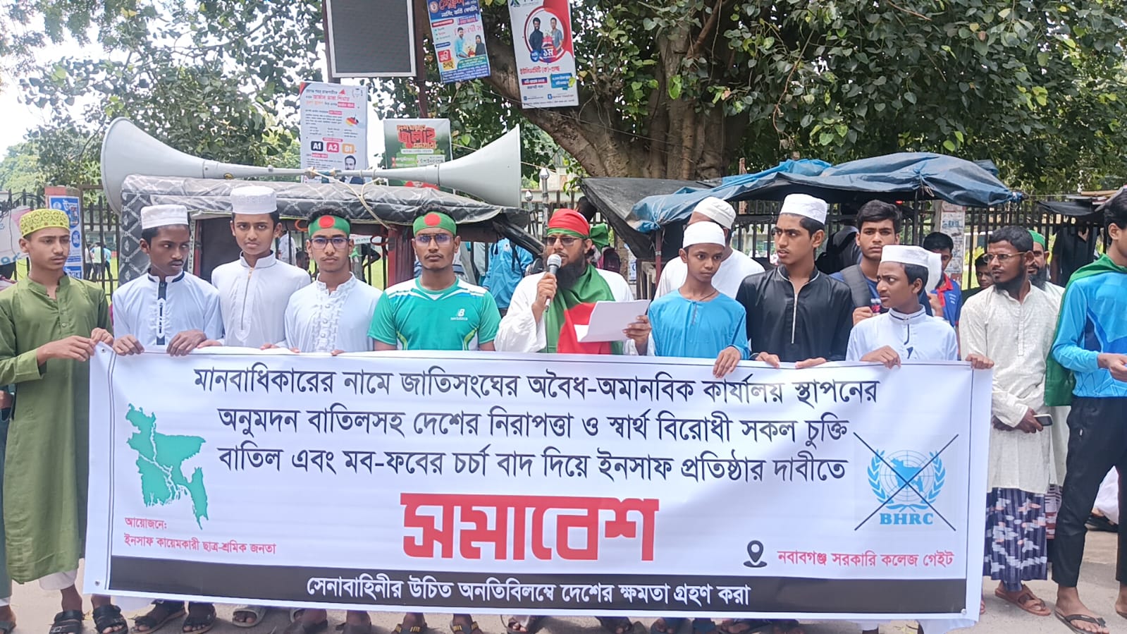 চাঁপাইনবাবগঞ্জ সরকারি কলেজ গেইটের সামনে সোমবার (১৮ আগষ্ট) সকালে ইনসাফ কায়েমকারী ছাত্র-শ্রমিক জনতার আয়োজনে এক বিক্ষোভ সমাবেশ অনুষ্ঠিত হয়েছে। সমাবেশে বক্তারা দেশের সার্বভৌমত্ব ও স্বাধীনতার বিরুদ্ধে নানা ষড়যন্ত্রের অভিযোগ তুলে ধরেন। একই সঙ্গে বিদেশি স্বার্থে করা নানা চুক্তি, উদ্যোগ ও পরিকল্পনার বিরুদ্ধে প্রতিবাদ জানান।