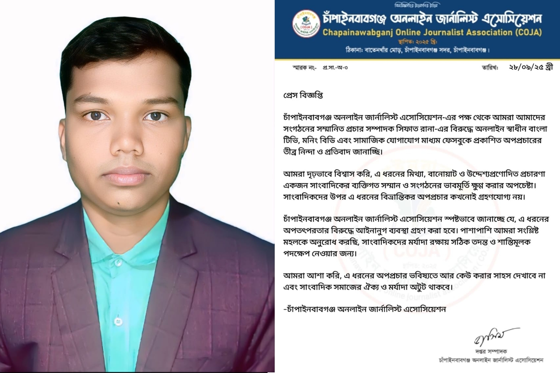 জানা যায়, রবিবার (২৮ সেপ্টেম্বর) মর্নিং বিডি, স্বাধীন বাংলা টিভি নামের একটি অনিবন্ধিত ও ভুয়া অনলাইন পোর্টাল ও ফেসবুক পেইজ থেকে সাংবাদিক সিফাত রানার নামে অপপ্রচার চালানো হয়েছে। অথচ সিফাত রানা দীর্ঘদিন ধরে পেশাদার সাংবাদিক হিসেবে চাঁপাইনবাবগঞ্জ জেলায় সুনামের সাথে কর্মরত রয়েছেন। তার সাফল্যে ইর্ষান্নিত হয়ে একটি কুচক্রী মহল ও স্বৈরাচারের দোসররা এমন গুজব প্রচার করছে।
